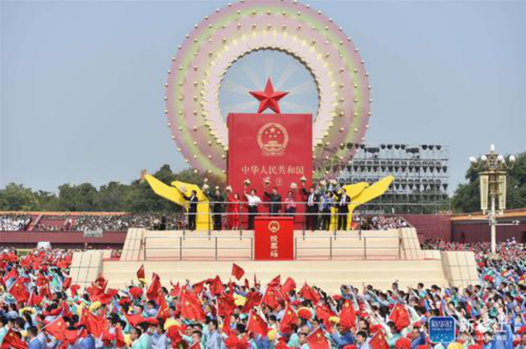70年大慶中,政法英模登上“民主法治”彩車,經(jīng)過天安門。(圖:新華社)