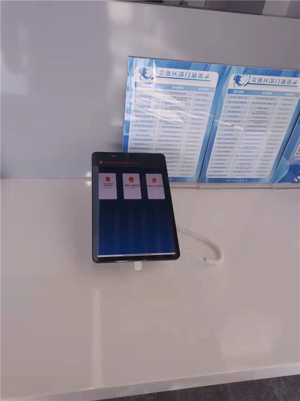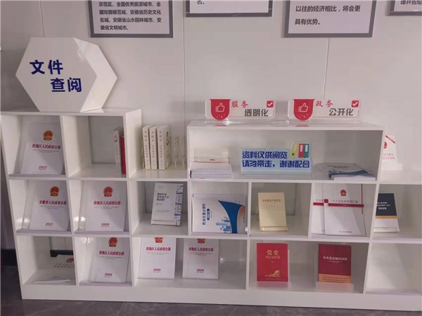 2.政府信息查詢配置電腦、平板、觸摸查詢機,觸摸查詢機搭載政務公開查詢系統,方便群眾瀏覽政府門戶網站與政策文件庫,引導辦事群眾進行政策信息的查閱。借助書柜,展示精心梳理的辦事服務指南與政策匯編,并且還擺放了政務公開類材料與相關書籍供群眾閱讀。除去這些傳統的配置,貴池區考慮到當下青年人的閱讀習慣,組織領導開發了一套政府公報閱讀系統,實現了政府公報移動端便捷閱讀。同時利用平板電腦展示貴池區區直部門、鄉鎮單位通訊錄,充分考慮群眾需求,將公開滲透到專區設計的每個角落。