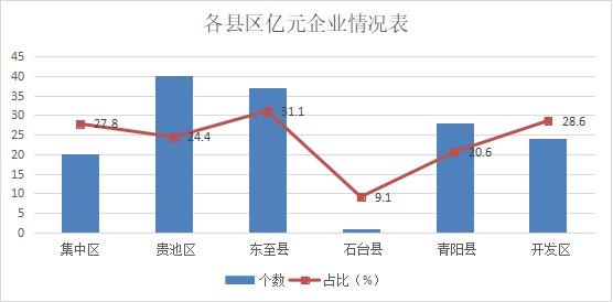 分縣區看,6個縣區均有億元以上企業,其中,貴池區40家,東至縣37家,青陽縣28家,開發區24家,集中區20家,石臺縣1家。分地區億元企業數量占比看,東至縣和開發區較高,分別為31.1%和28.6%。石臺縣占比最低,為9.1%。