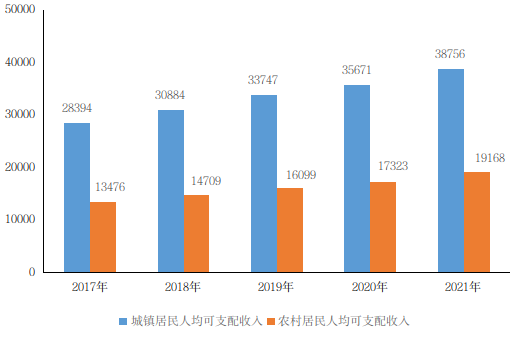 2017—2021年全市城、鄉(xiāng)居民人均可支配收入