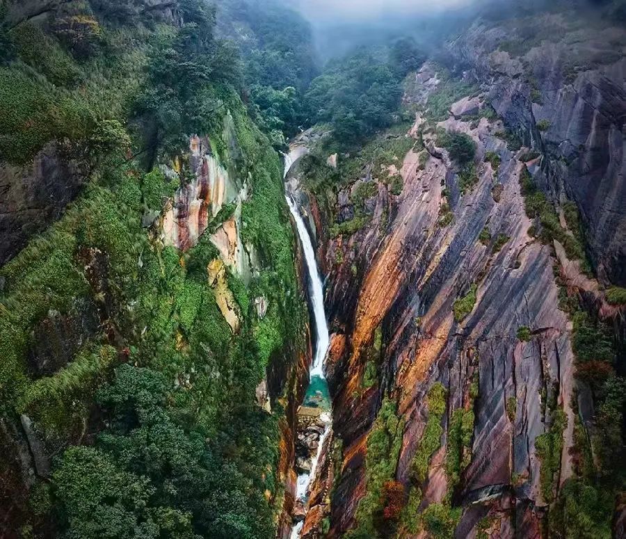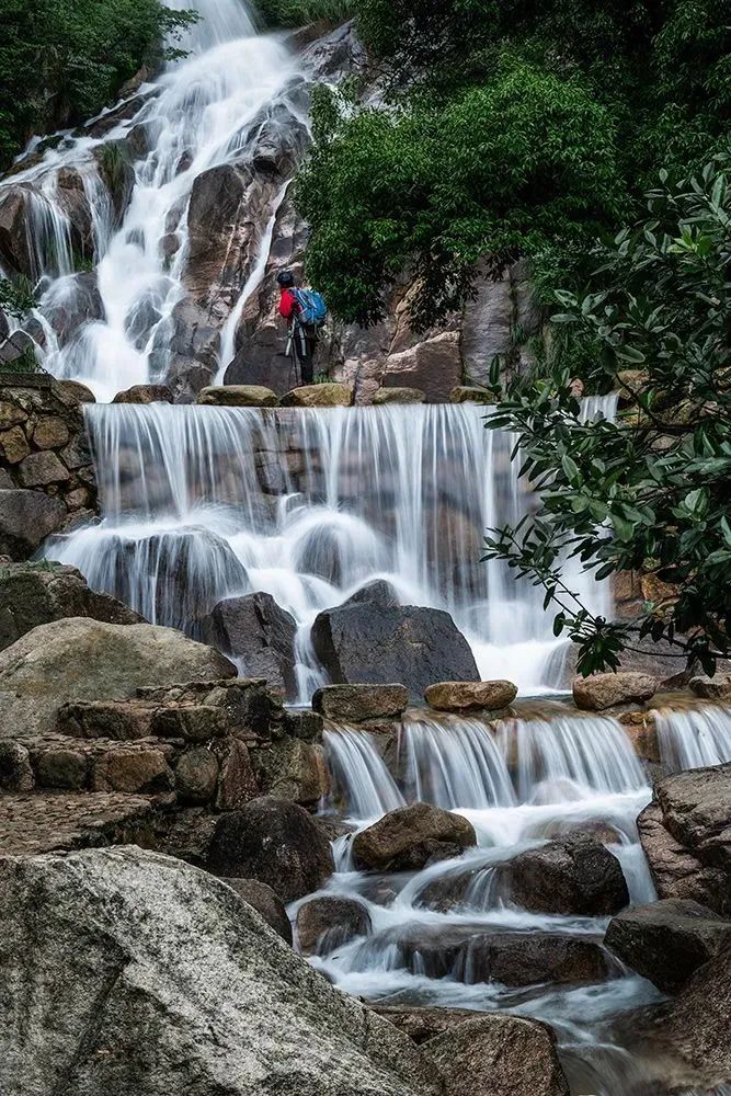 七布泉是九子巖景區眾多景點中最靚麗的一個,它源自山頂上九子峰,此花崗巖山峰狀如九個嬰兒團聚在母親身邊嬉戲,第一次見到我不禁驚詫于大自然的神來之筆。附近的山坡上遍布楓樹、樟樹、櫸樹、紅豆杉、青檀等樹木,常年綠樹蔥蘢。一年四季溪水淙淙。七布泉高低落差80米,兩邊峭壁夾峙,瀑布輾轉七折而下,泉敲陡壁,聲貌動人。