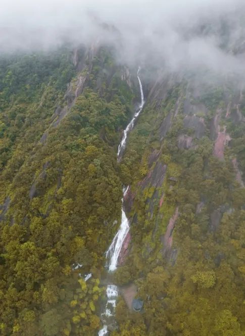 雨中的七布泉有種朦朧的美,青黛的山被煙云籠罩,九子峰在煙云中上下沉浮,或露出山峰、或被煙云吞沒,似一幅立體水墨畫。這天水之間,每一片巖石都被洗得干干凈凈。石縫里青草、苔鮮,溪邊不知名的野花也點綴著一份詩意。腦海中忽然閃現蘇軾的詩句“山色空蒙雨亦奇”,是的,只有身處此景才能體悟此句的意境美。