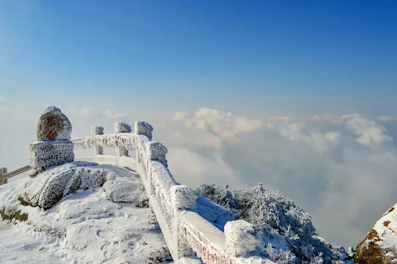 乘纜車上行,一路上,仿佛置身于一個琉璃世界。被雪漂過的天空藍透了,干凈得不帶一點塵色,白云了無痕跡。山峰、峭壁、深林開在碩大的冰花里,如一個個神圣莊嚴的蓮花寶座。俯瞰下去,萬千林海冰花凝結,仿佛《冰雪奇緣》中的奇妙場景就在眼前上演。