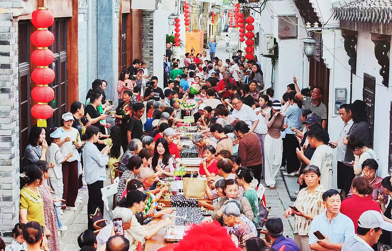 夕陽(yáng)余暉灑在古樸的老街上,煙火氣在街巷間緩緩升騰。老街民宿廚房里,水汽彌漫,一籠籠美食香氣四溢;十字路口處,小型舞臺(tái)搭建完畢,十幾張長(zhǎng)桌首尾相連、一字排開(kāi)。隨著旱船燈表演的鑼鼓聲響起,居民們從四面八方趕來(lái),圍坐長(zhǎng)桌拉家常,等待開(kāi)席。看到參與人數(shù)越來(lái)越多,池州市飛地文化發(fā)展有限公司負(fù)責(zé)人胡倩趕忙安排人手添加桌椅。