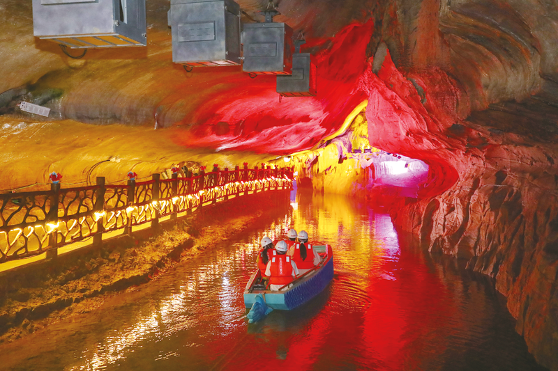 4A級旅游景區石臺縣魚龍洞通過實施數字化改造,打造4幕投影,同時新增智能軌道龍船,實現由傳統觀光旅游向裸眼3D沉浸式體驗轉變,成為夏日游客熱門打卡地。圖為游客乘船游覽溶洞。