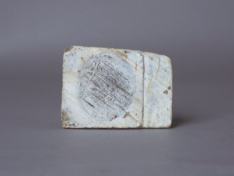 這枚石錛通長僅8.5厘米、通寬6.5厘米、重200克,青灰色石身雖無華麗光澤,卻透著歲月沉淀的厚重。其最為特別的是兩處匠心設(shè)計(jì):靠近背部的器身被精心加工成整齊的二級階梯形,將石錛清晰分成上下兩段,“有段石錛”的名稱便由此而來;正面陰刻的圓形符號,宛如一輪簡化的太陽,在同時(shí)期相對樸素的石質(zhì)工具中顯得格外突出。