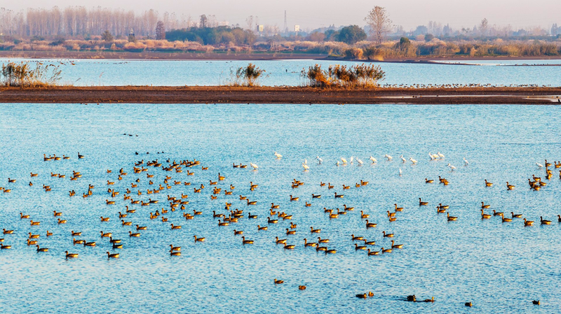 升金湖是東亞-澳大利西亞候鳥遷徙線上的重要“驛站”。這里春為沃野夏為湖,秋冬水落灘出,水草豐美、魚蝦成群,是候鳥越冬棲息的理想之地。冬日暖陽傾瀉湖面,候鳥或展翅盤旋,或駐足休憩,或低頭覓食,一派生機盎然的景象。