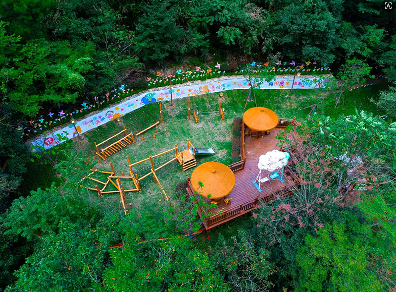 谷中并非只有石與水,更有古木與苔痕交織的幽微生機。自“孔雀瀑”上行,步道轉入名為“綠野仙蹤”的原始林帶。濃蔭蔽日,古木參天,樹齡480年的紫薇與680年的甜櫧交織成穹蓋,枝椏間垂下細長松蘿,風過時微微搖曳。林間鋪設木質平臺與樹屋,孩童的笑聲與鳥鳴相和,為清冷的初冬添了幾分暖意。更妙的是林中“尋羽門”—— 一座由七彩鵝卵石壘成的拱門,門后小徑通向幽深洞穴,傳說拾得洞中白羽者可獲“仙緣”。我卻在石徑旁停住:一株老樹根系從石縫間蜿蜒而出,緊緊“抱”住堅硬巖體,仿佛誓與石頭共存亡。它把根須扎進最貧瘠的縫隙,把軀干伸向最稀薄的光線,年復一年,把傷痕長成姿態。這樣的生命,與谷中石頭互為映照—— 一個柔韌,一個堅剛;一個向下生長,一個向上屹立。人與自然在此達成默契,彼此守望,彼此成全。