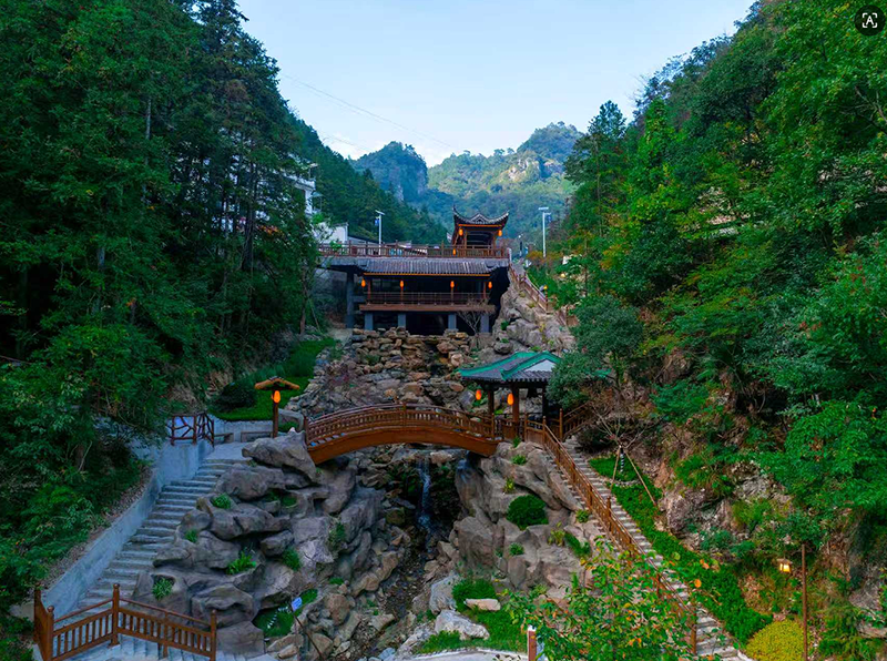 下行至谷底,一座藤蔓纏繞的木拱橋靜臥清溪之上,名曰問仙橋。橋身不施一釘,榫卯相銜,橋下溪水清澈見底,棕紅色的彩石在水流沖刷下泛著玉質光澤。初冬水溫更涼,指尖一觸,寒意便順著脈管攀上來,卻也把谷中萬物的輪廓洗得更加分明——巖壁的紋理、石面的光澤、水紋的走向,在清冷里一一顯露,那是內斂的鋒芒。