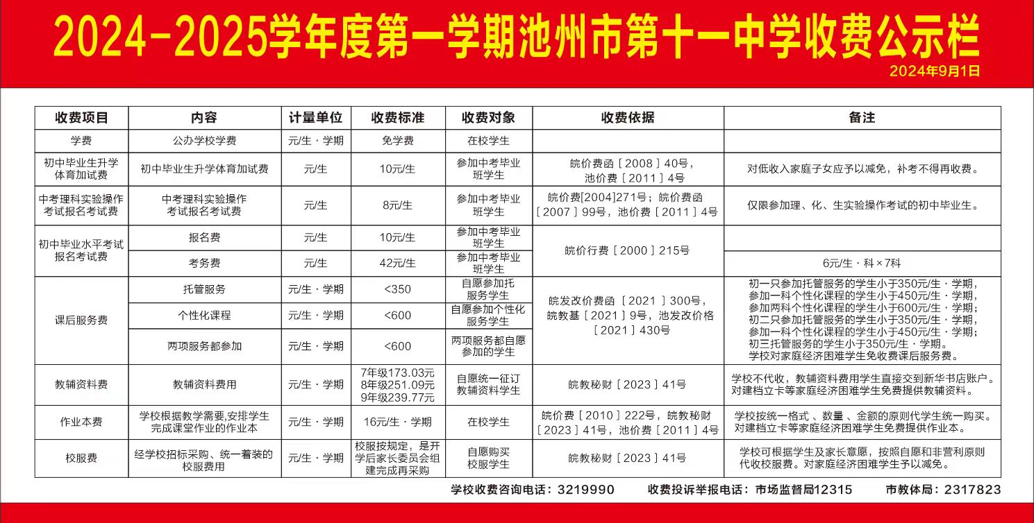 池州十一中2024-2025學(xué)年度第一學(xué)期收費(fèi)公示欄