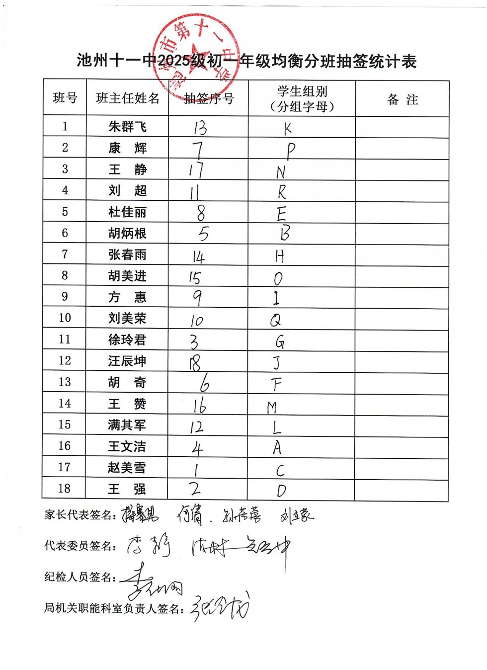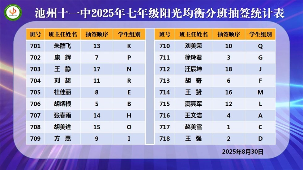 根據《池州市第十一中學2025級七年級陽光均衡分班實施方案》,8月30日晚,我校2025級七年級新生陽光均衡分班工作,在市紀委監委駐市教體局紀檢監察組人員、市教體局職能科室負責人、市(區)黨代表、人大代表、政協委員、學校家長委員會成員、七年級新生家長代表、新聞媒體的共同見證下圓滿完成。現將結果公布如下: