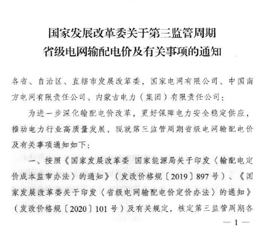 國家發(fā)展改革委關于第三監(jiān)管周期省級電網輸配電價及有關事項的通知