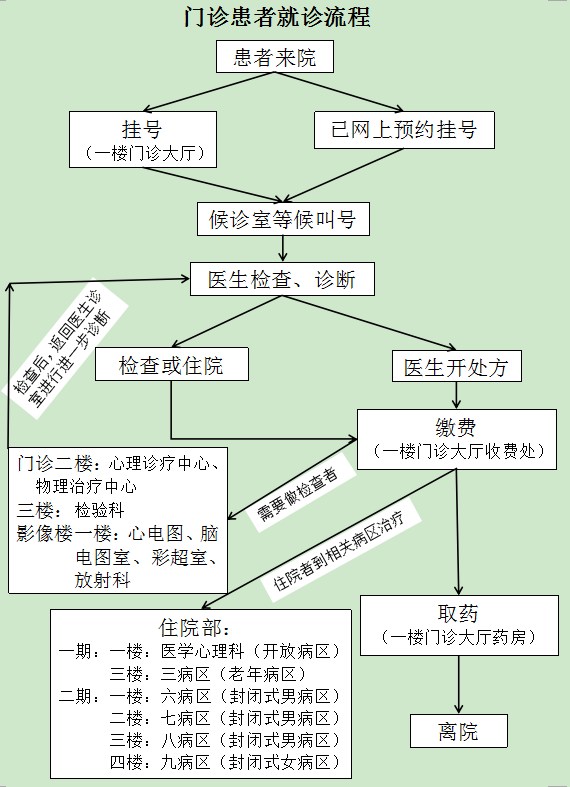 在診療科目方面,醫院專業設置全面,設有精神科(精神病專業、精神衛生專業、藥物依賴專業、精神康復專業、臨床心理專業)、預防保健科、內科(門診)、外科(門診)、婦科專業(門診)、醫學檢驗科(臨床體液、血液專業,臨床化學檢驗專業,臨床微生物學專業,臨床免疫、血清學專業)、醫學影像科(X線診斷專業、CT診斷專業、超聲診斷專業、心電診斷專業、腦電及腦血流圖診斷專業)、中醫科(門診)、全科醫療科(門診)、麻醉科、康復醫學科等,能夠為患者提供全方位的醫療服務。